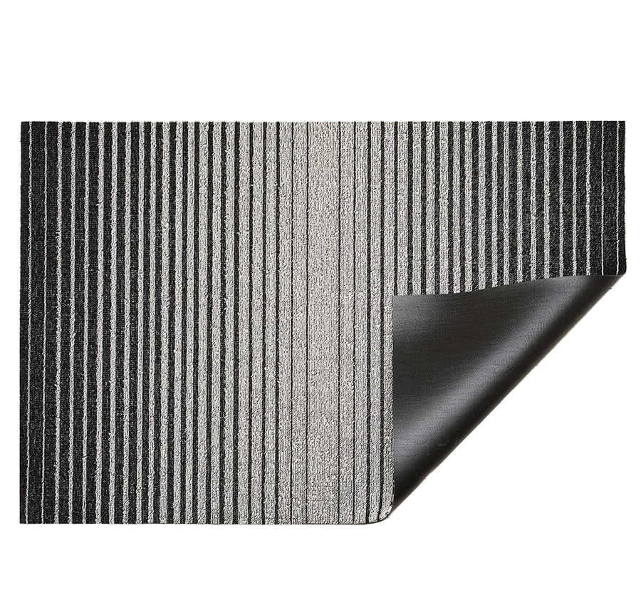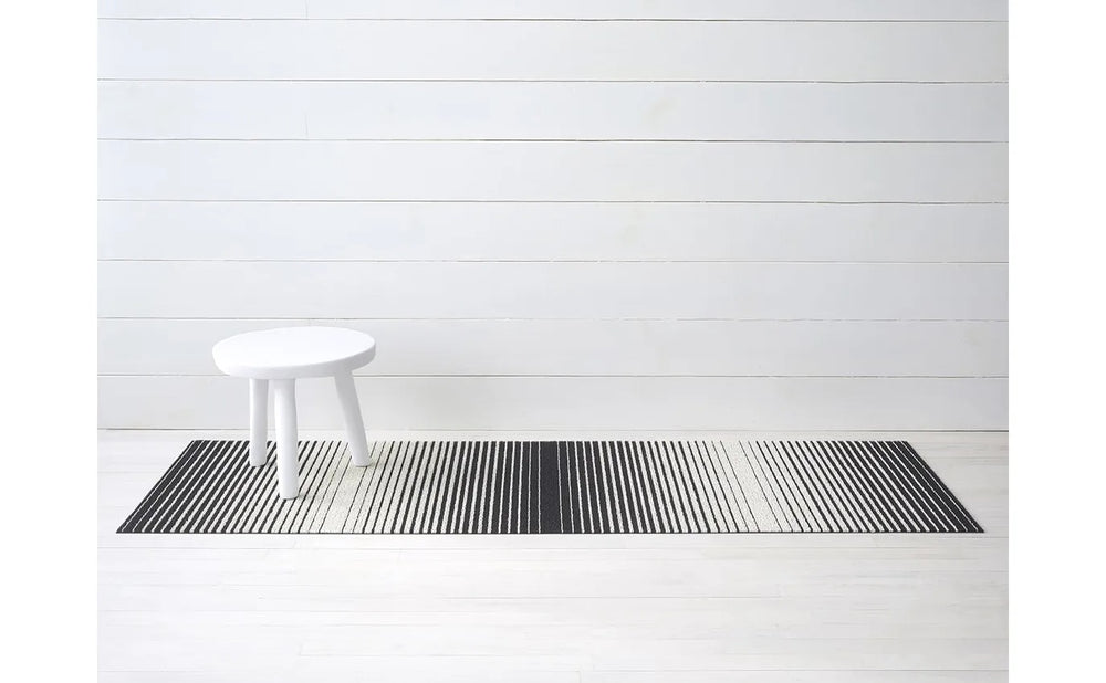 Inspired by the sharp contrast and mesmerizing motion of a cascading row of dominoes, the variegated stripes of this easy-care floor mat are at once dynamic and serene. Lines of varying widths create an ombré effect that is heightened when viewed at a distance.