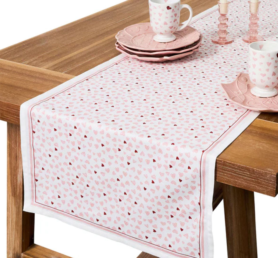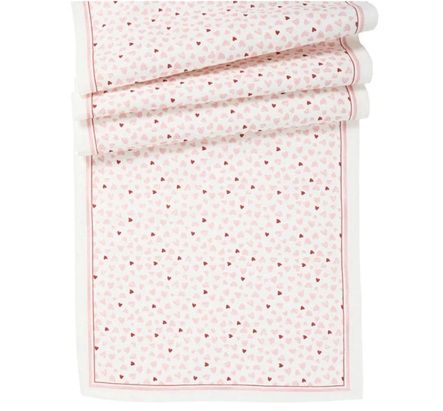 Pretty in pink, sprinkled with hearts, and trimmed with prim pinstripes, this table runner unfurls a cheerful and romantic feel to kitchen and dining tables, however casually or formally you style it.