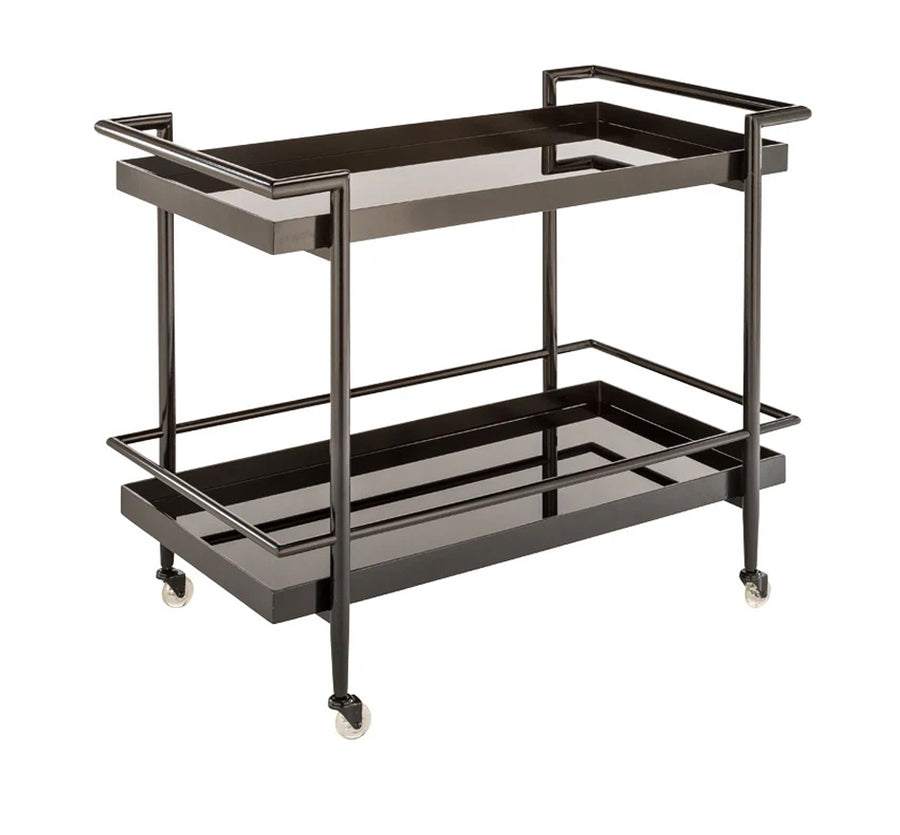 A truly versatile and stylish bar cart featuring sleek, black glass shelving with a black stainless steel tubular frame and legs or sleek, or black glass shelving with an antique brass stainless steel tubular frame and legs. Castors allow for easy mobility.