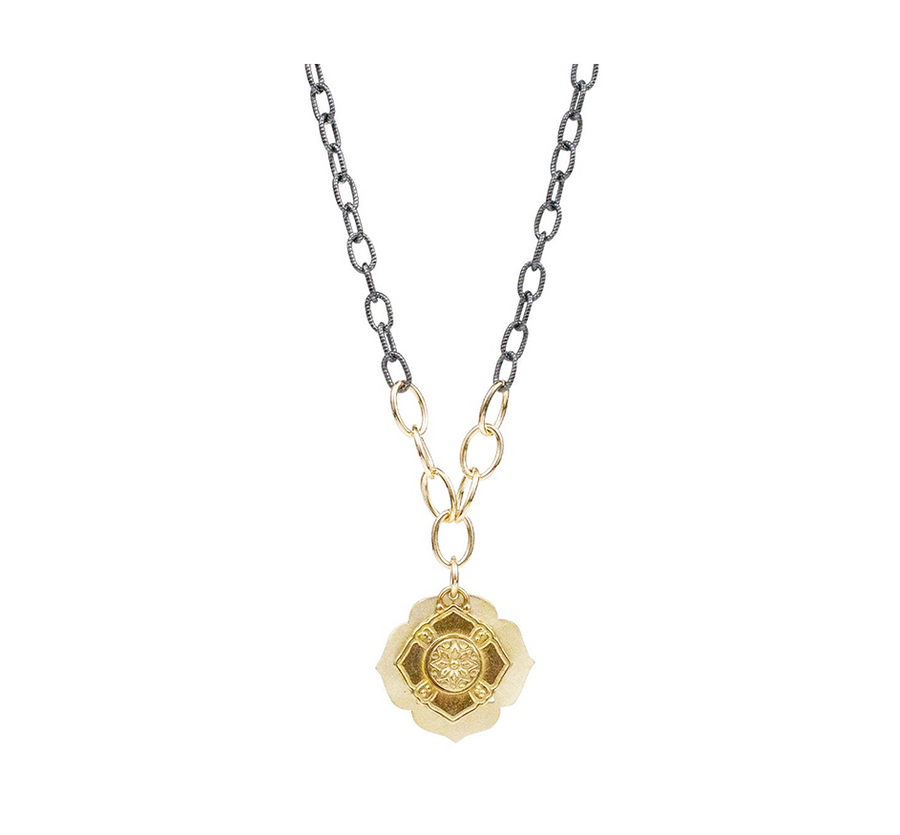 The shadows and layered light of a celestial event embodied by Eclipse. The yellow bronze Meta pendant—which features a floral motif—swings atop the backdrop of an open lotus pendant. Gold links and a textured silver chain combine for extra interest.
