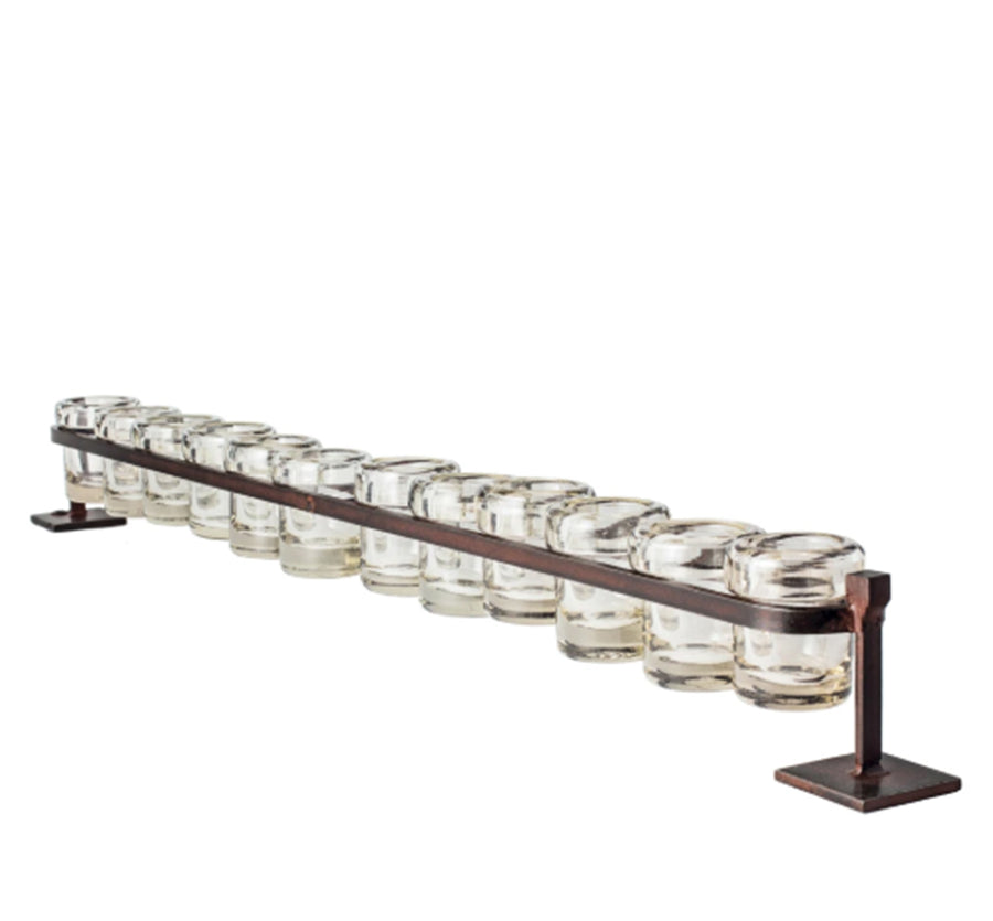 Wax cast railroad with 12 mouth blown glass votive holders on forged stand. Also great for small blossoms!