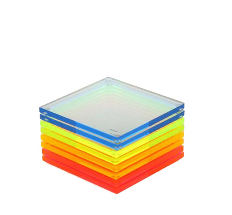 Sold in sets 8, Acrylic Coasters are a fun way to add color to your table. They have been handcrafted with the finest quality acrylic and are finished off with a small, clear rubber bumper to protect your table that also allows you to stack them on top of each other without scratching the acrylic. When stacked up, they make for an interesting sculpture object to add color to your table.