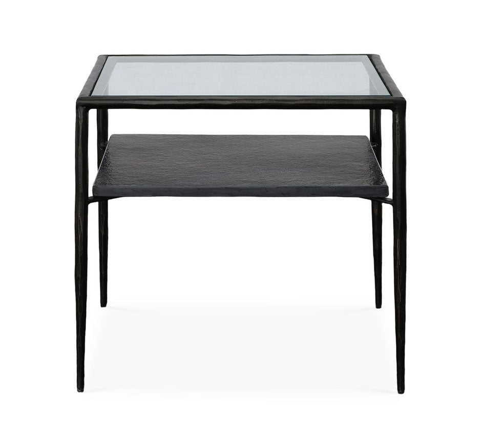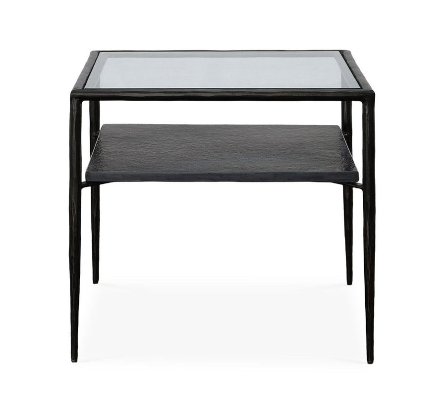 A soft hammered frame in satin black finish provides twice the storage and visual display. The top tier holds floating glass while the base tier is solid black granite with a leather-like finish.