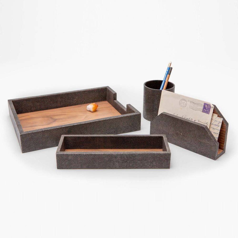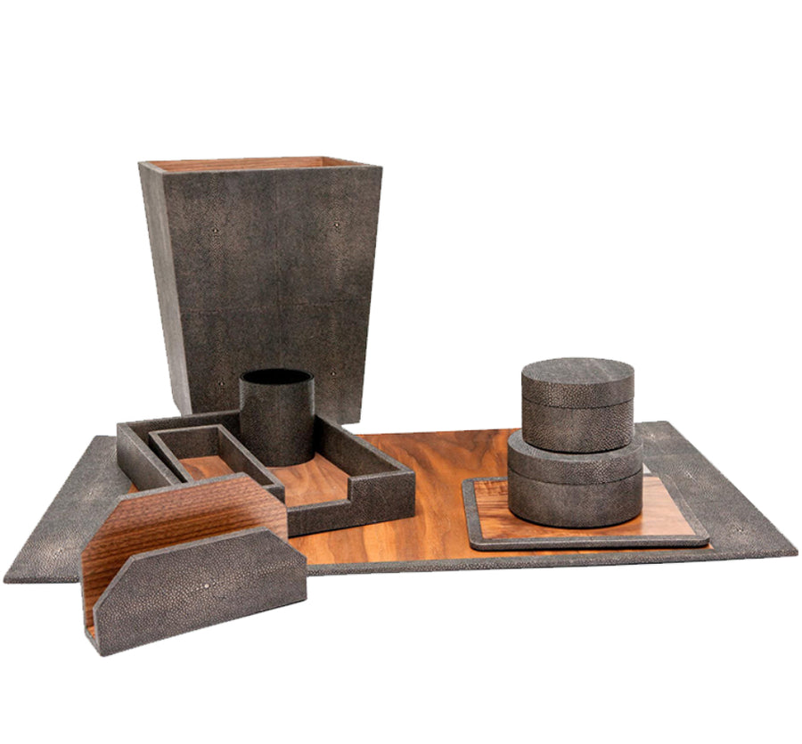 We’ve brought your favorite faux shagreen to the study. With complementary wood veneer accents, our Crosby set is a fetching finish for any desk, bringing organization to a new level of sophistication. Wastebaskets include gray powder coated metal liner.