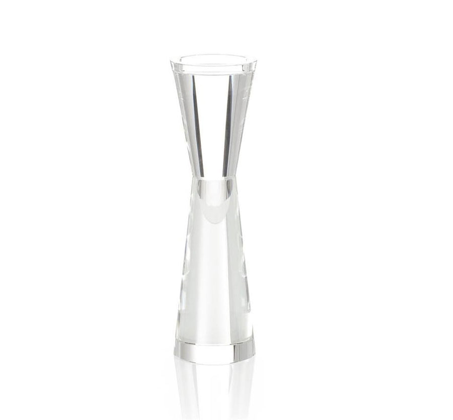 A sleek, minimalist silhouette beautifully complements the polished crystal body of this stunning hourglass-shaped candleholder. This beautiful simplicity exhibited in this piece allows it to adapt to nearly any interior space it is placed in. The Crystal Hourglass Candleholder is a gorgeous addition to any space on its own, but may also be placed next to its larger variants to further enhance the look.
