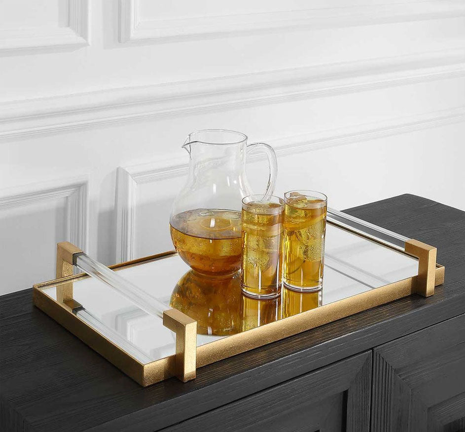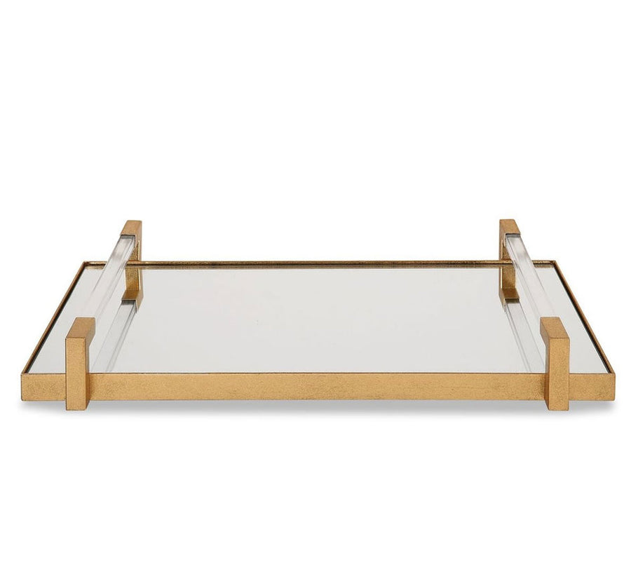 Hand forged iron frame finished in a lightly antiqued gold leaf accented with suspended, clear acrylic, solid square bars and mirror interior.