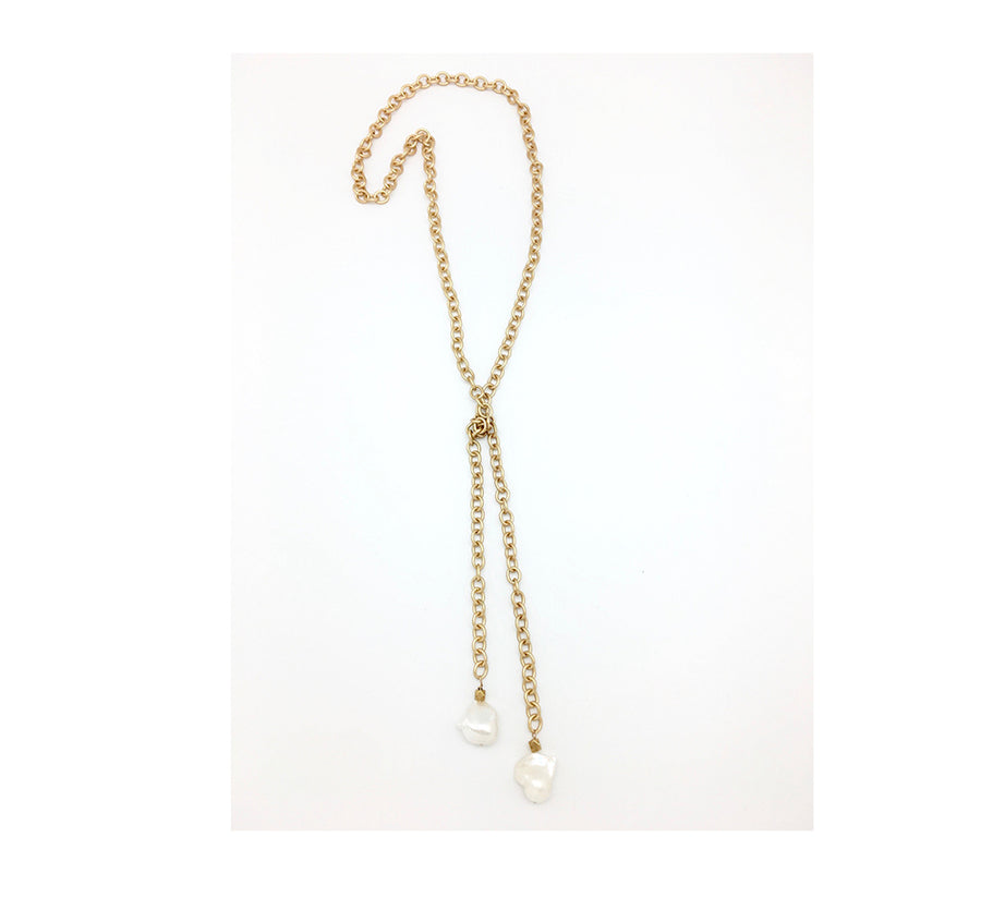 Beautiful gold lariat, with feminine baroque pearl drops on each end. 34” long.
