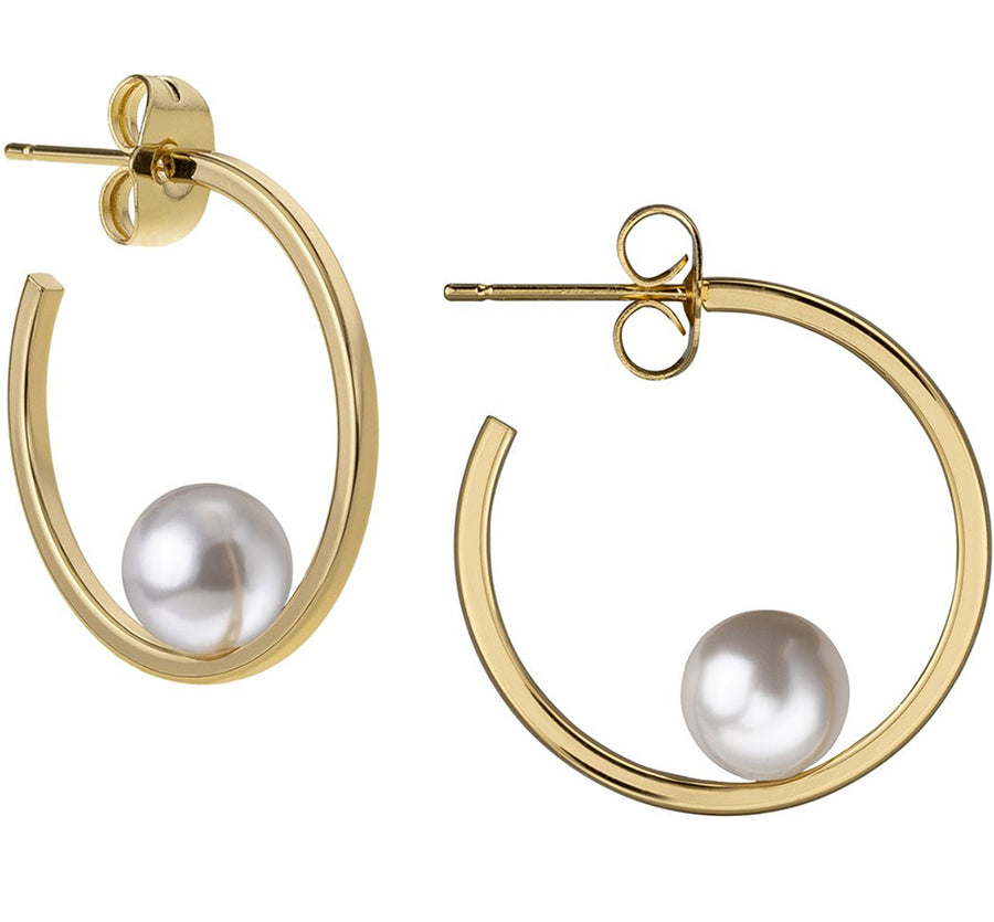 Highly polished gold hoops with a single white pearl balanced delicately on inside bottom.