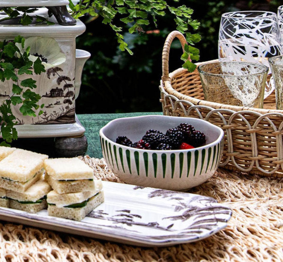 The classic white cereal/ice cream bowl is enlivened with a sculptural rim that is clad in radiant stripes of fresh Basil green, making everything from morning oats to sundaes at sunset a little moment to celebrate.